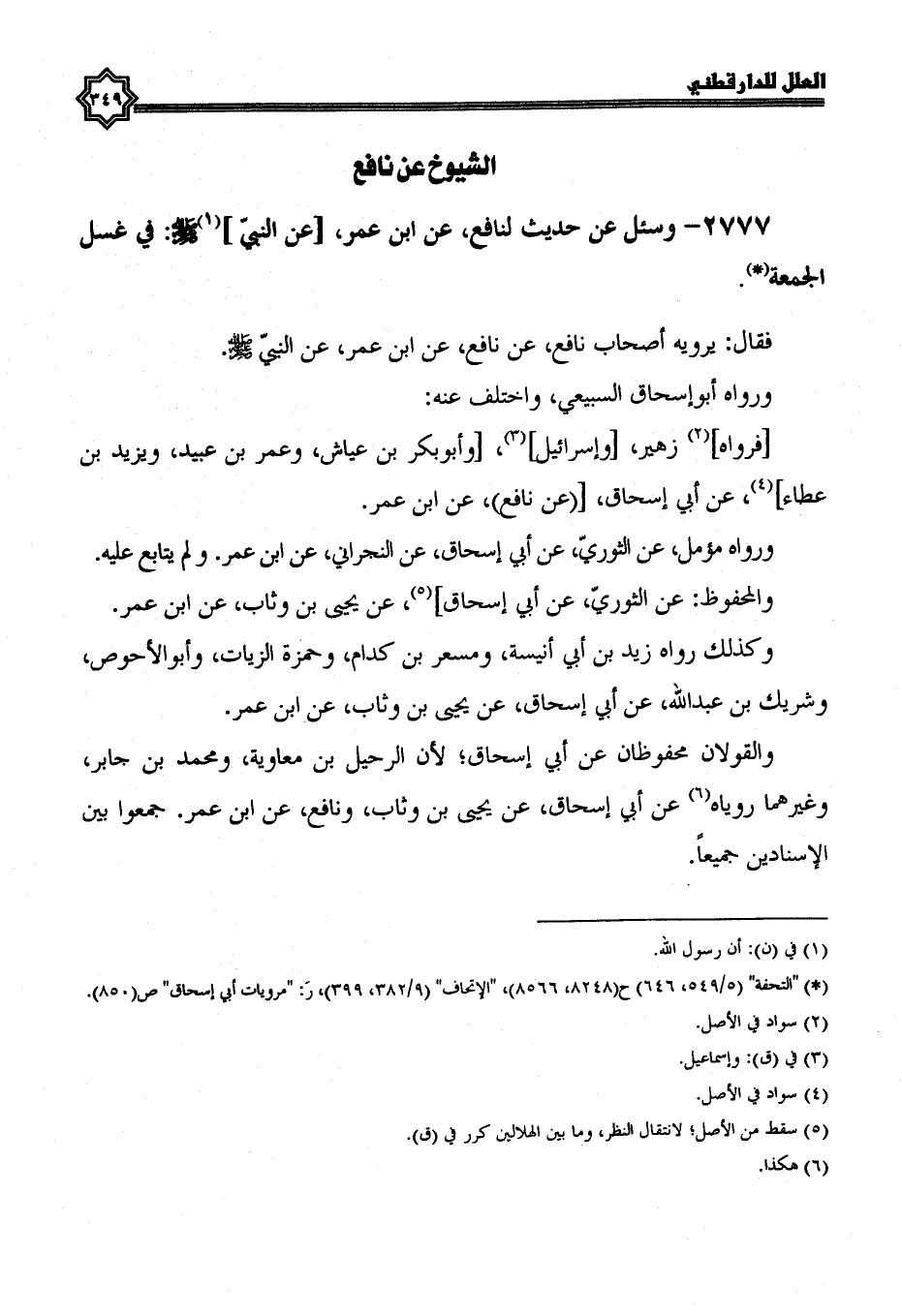 2777- وسئل عن حديث لنافع، عَنِ ابْنِ عُمَرَ، عَنِ النَّبِيِّ صَلَّى اللَّهُ عليه وسلم، في غسل الجمعة.
