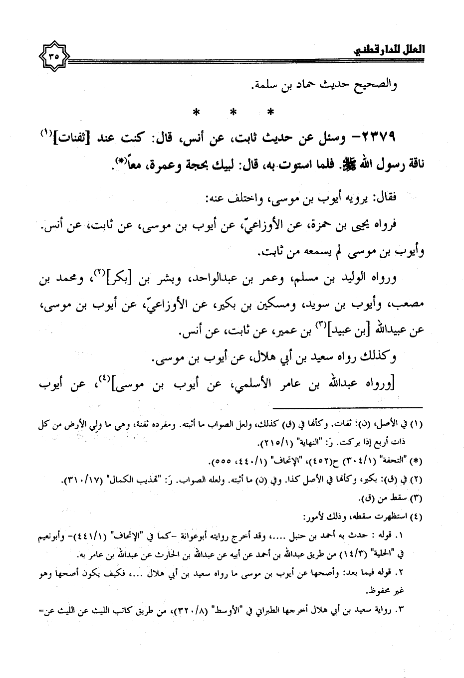 2379- وسئل عن حديث ثابت، عن أنس، قال: كنت عند ثفنات نَاقَةِ رَسُولِ اللَّهِ صَلَّى اللَّهُ عَلَيْهِ وَسَلَّمَ، فلما استوت به قَالَ: لَبَّيْكَ بِحَجَّةٍ وَعُمْرَةٍ مَعًا.