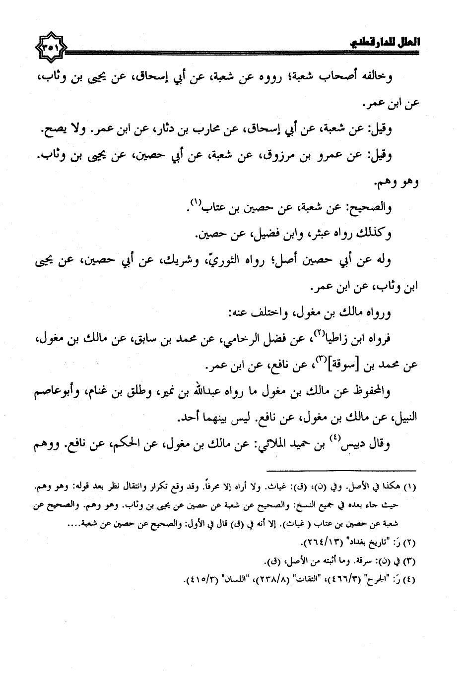 وَقِيلَ: عَنْ شُعْبَةَ، عَنْ أَبِي إِسْحَاقَ، عَنْ محارب بن دثار، عن ابن عمر ولا يصح وقيل: عن عمرو بن مرزوق، عن شعبة، عَنْ أَبِي حُصَيْنٍ، عَنْ يَحْيَى بْنِ وَثَّابٍ، وهو وهم والصحيح: عن شعبة، عن حصين بن عتاب وكذلك رواه عبثر، وابن فضيل، عن حصين، وله، عن أبي حصين أصل؛ رواه الثوري وشريك، عَنْ أَبِي حُصَيْنٍ، عَنْ يَحْيَى بْنِ وَثَّابٍ، عن ابن عمر.