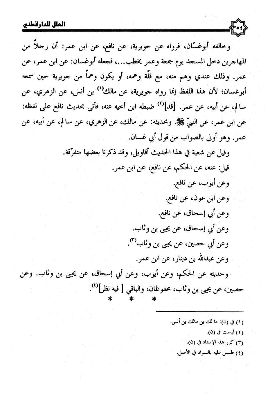 فرواه عن جويرية، عن نافع، عن ابن عمر أن رجلا من المهاجرين دخل المسجد يوم جمعة وعمر يخطب ... ، فجعله أبو غسان عن ابن عمر، عن عمر وذلك عندي وهم منه مع قلة وهمه، أو يكون وهما من جويرية، حين سمعه أبو غسان لأن هذا اللفظ إنما رواه جويرية عَنْ مَالِكِ بْنِ أَنَسٍ، عَنِ الزُّهْرِيِّ، عَنِ سالم، عن أبيه، عن عمر، قد ضبطه ابن أخيه عنه، فأتى بحديث نافع على لفظه، عَنِ ابْنِ عُمَرَ، عَنِ النَّبِيِّ صَلَّى اللَّهُ عليه وسلم، وبحديثه عَنْ مَالِكٍ، عَنِ الزُّهْرِيِّ، عَنْ سَالِمٍ، عَنِ أَبِيهِ، عَنْ عمر وهو أولى بالصواب، من قول أبي غسان.