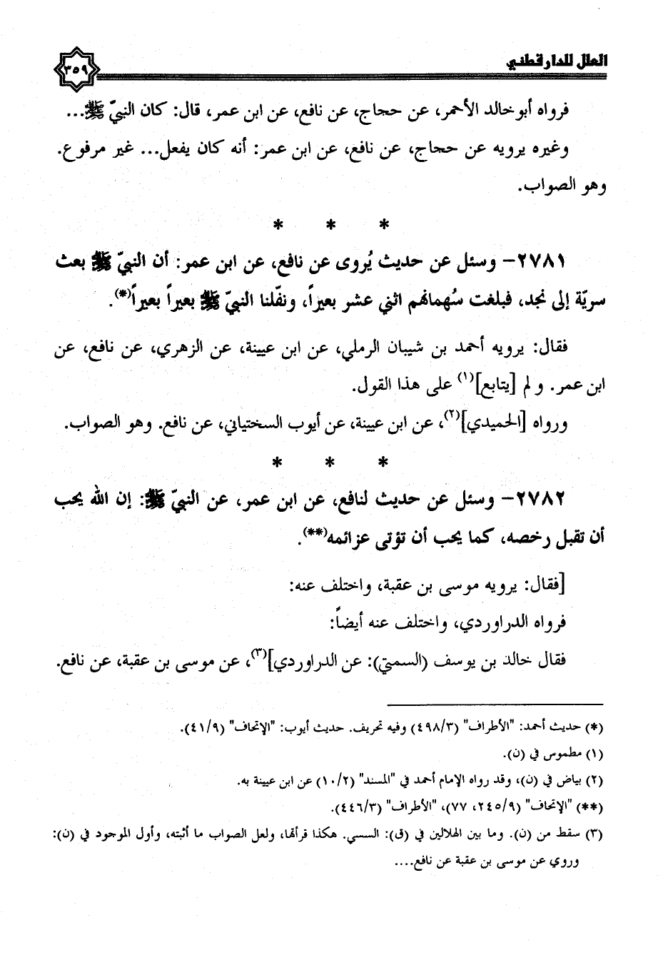 2782- وسئل عن حديث لنافع، عَنِ ابْنِ عُمَرَ، عَنِ النَّبِيِّ صَلَّى اللَّهُ عليه وسلم: إن الله يحب أن تقبل رخصه، كما يحب أن تؤتى عزائمه.