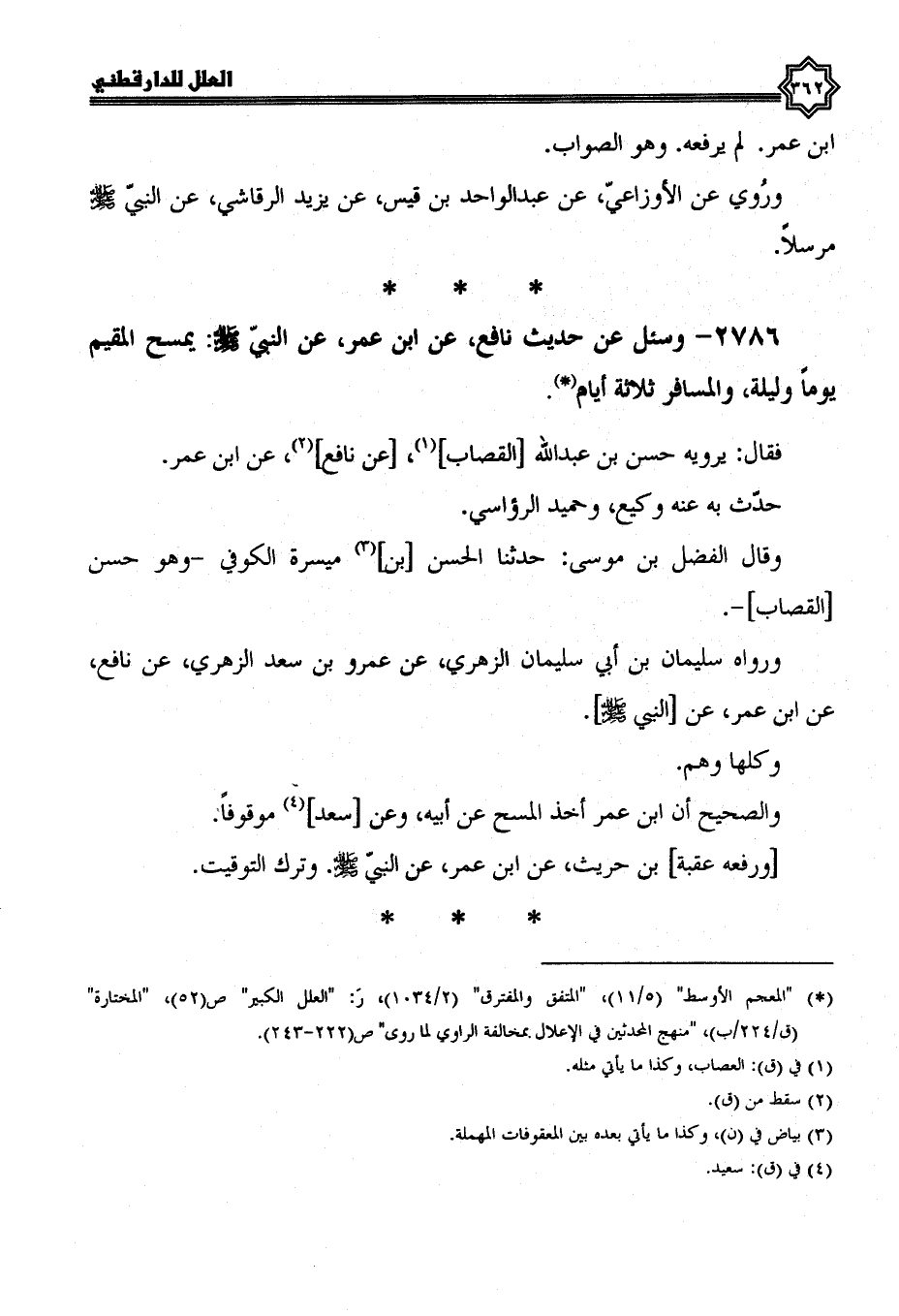 2786- وَسُئِلَ عَنْ حَدِيثِ نَافِعٍ، عَنِ ابْنِ عُمَرَ، عَنِ النَّبِيِّ صَلَّى الله عليه وسلم: يمسح المقيم يوما وليلة، والمسافر ثلاثة أيام.