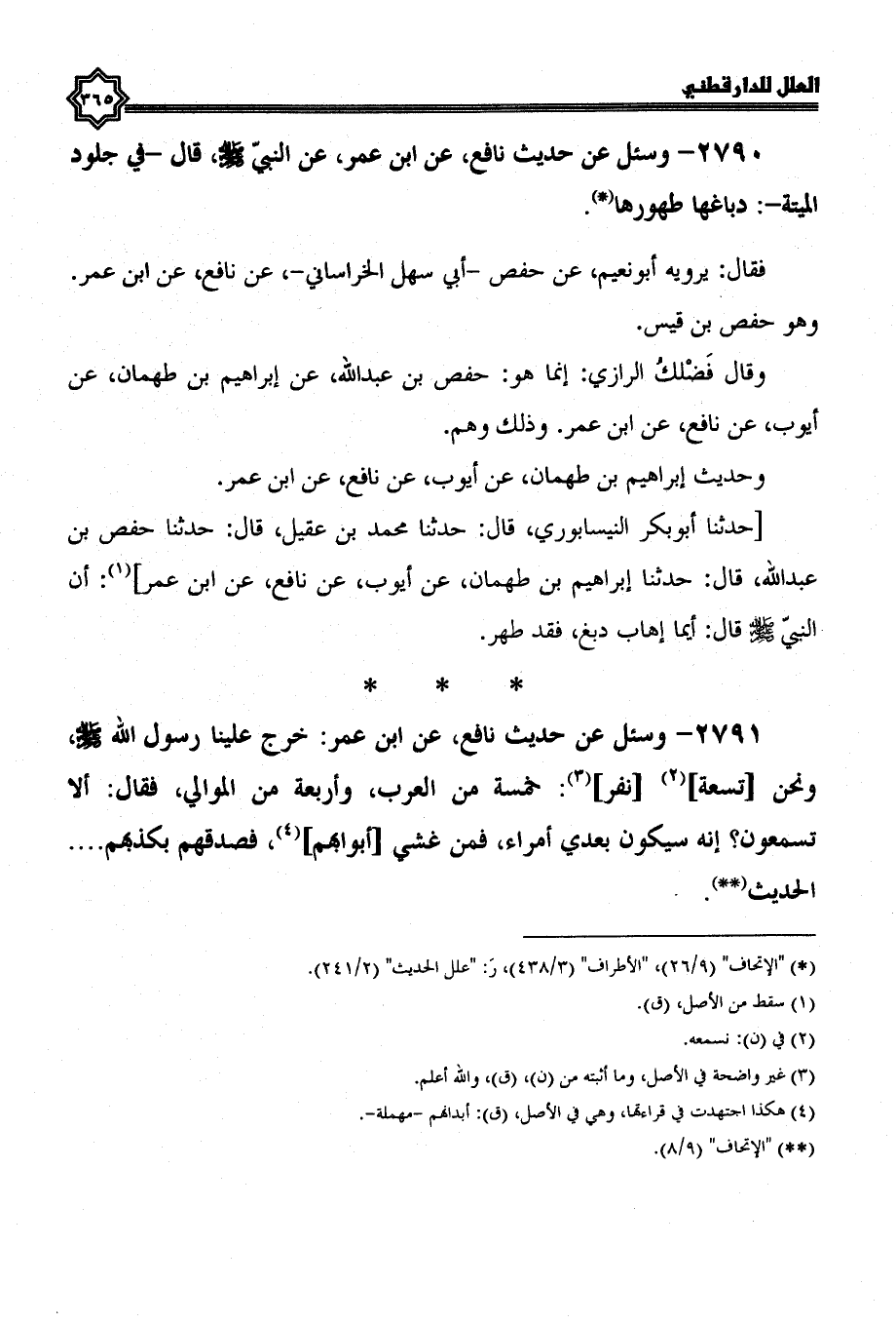 2790- وَسُئِلَ عَنْ حَدِيثِ نَافِعٍ، عَنِ ابْنِ عُمَرَ، عَنِ النَّبِيِّ صَلَّى الله عليه وسلم، قال، في جلود الميتة: دباغها طهورها.