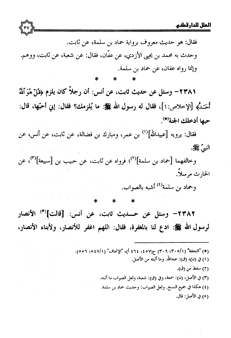 2381- وسئل عن حديث ثابت، عن أنس أن رجلا كان يلزم: {قل هو الله أحد} ، فَقَالَ لَهُ رَسُولُ اللَّهِ صَلَّى اللَّهُ عَلَيْهِ وسلم: ما يلزمك؟ فقال: إني أحبها، قال: حبها أدخلك الْجَنَّةِ.