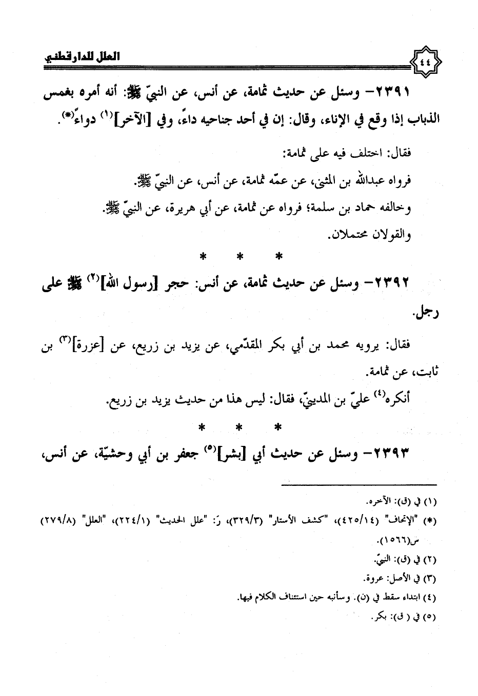 2391- وسئل عن حديث ثُمَامَةَ، عَنْ أَنَسٍ، عَنِ النَّبِيِّ صَلَّى اللَّهُ عَلَيْهِ وسلم؛ أنه أمره بغمس الذباب إذا وقع في الإناء، وقال: إن في أحد جناحيه داء، وفي الآخر دواء.