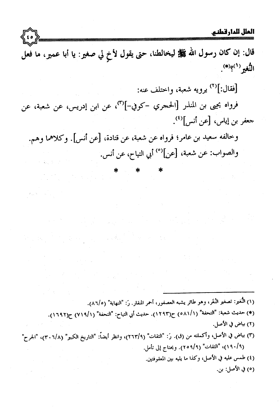 2393- وسئل عن حديث أبي بشر جعفر بن أبي وحشية، عن أنس، قال: إن كَانَ رَسُولُ اللَّهِ صَلَّى اللَّهُ عَلَيْهِ وَسَلَّمَ ليخالطنا، حتى يقول لأخ لي صغير: يا أبا عمير، ما فعل النغير؟.