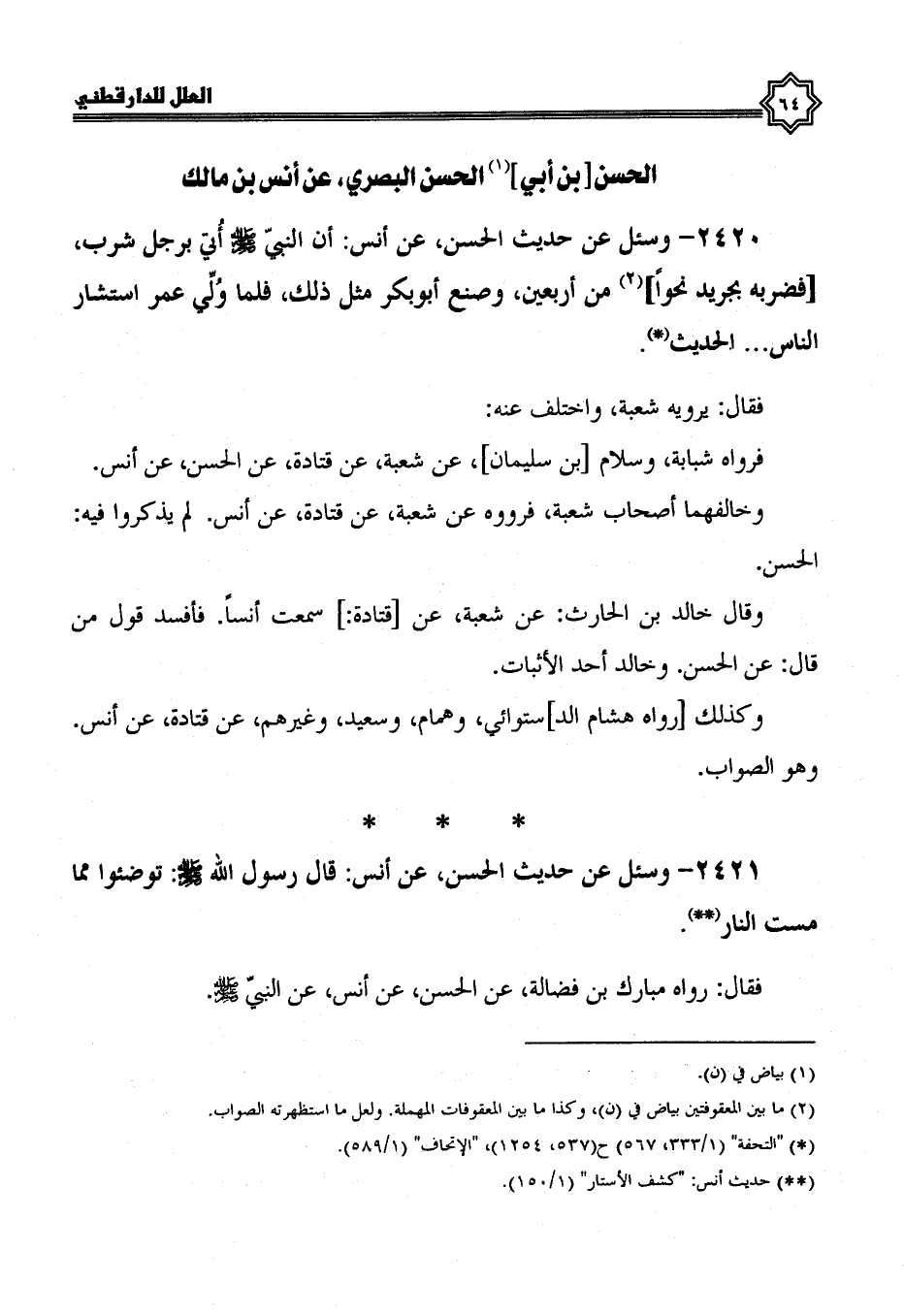 2420- وسئل عن حديث الحسن، عَنْ أَنَسٍ أَنَّ النَّبِيَّ صَلَّى اللَّهُ عَلَيْهِ وَسَلَّمَ أُتِيَ برجل شرب، فضربه بجريد نحوا من أربعين، وصنع أبو بكر مثل ذلك، فلما ولي عمر استشار الناس ... الحديث.