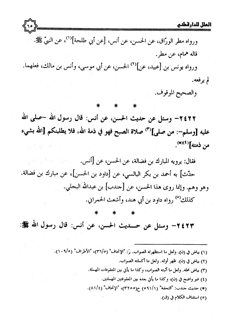 2422- وسئل عن حديث الحسن، عن أنس، قال رسول الله، صلى الله عليه وسلم: من صلى صلاة الصبح فهو في ذمة الله، فلا يطلبنكم الله بشيء من ذمته.
