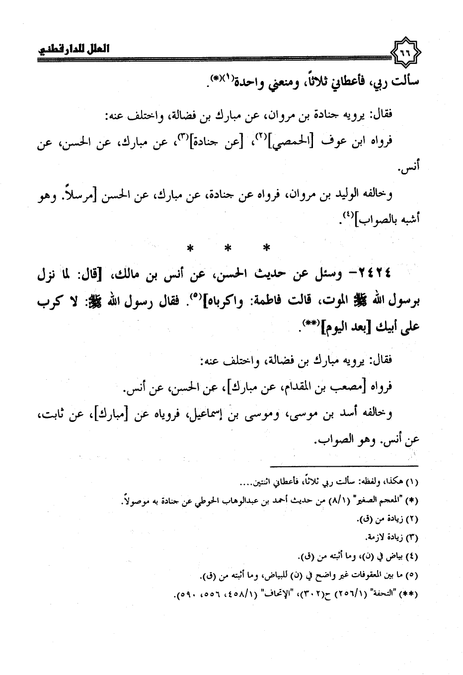 2424- وسئل عن حديث الحسن، عن أنس بن مالك، قال: لما نزل برسول الله صلى الله عليه وسلم الموت، قالت فاطمة: واكرباه، فَقَالَ رَسُولُ اللَّهِ صَلَّى اللَّهُ عَلَيْهِ وَسَلَّمَ: لا كرب على أبيك بعد اليوم.