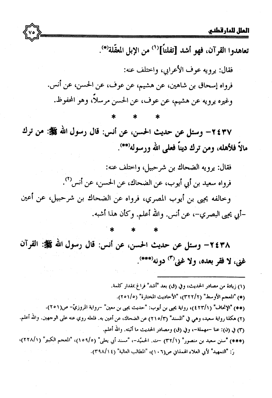 2436- وسئل عن حديث الحسن، عن أنس، قال رسول الله صلى الله عليه وسلم: تعاهدوا القرآن، فهو أشد تفلتا من الإبل المعقلة.