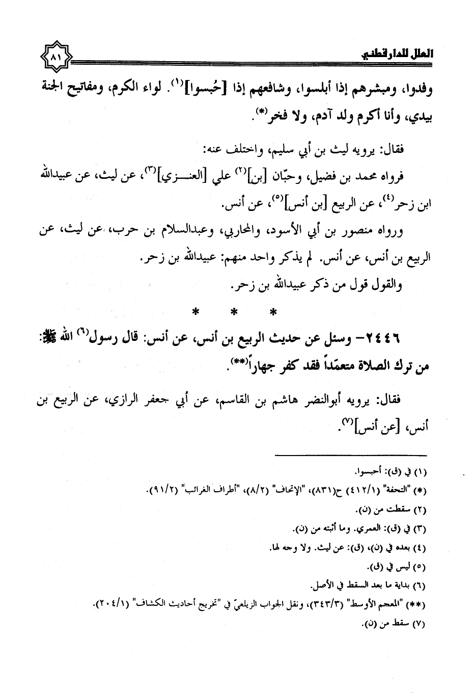 2446- وسئل عن حديث الربيع بن أنس، عن أنس، قال رسول الله صلى الله عليه وسلم: من ترك الصلاة متعمدا فقد كفر جهارا.