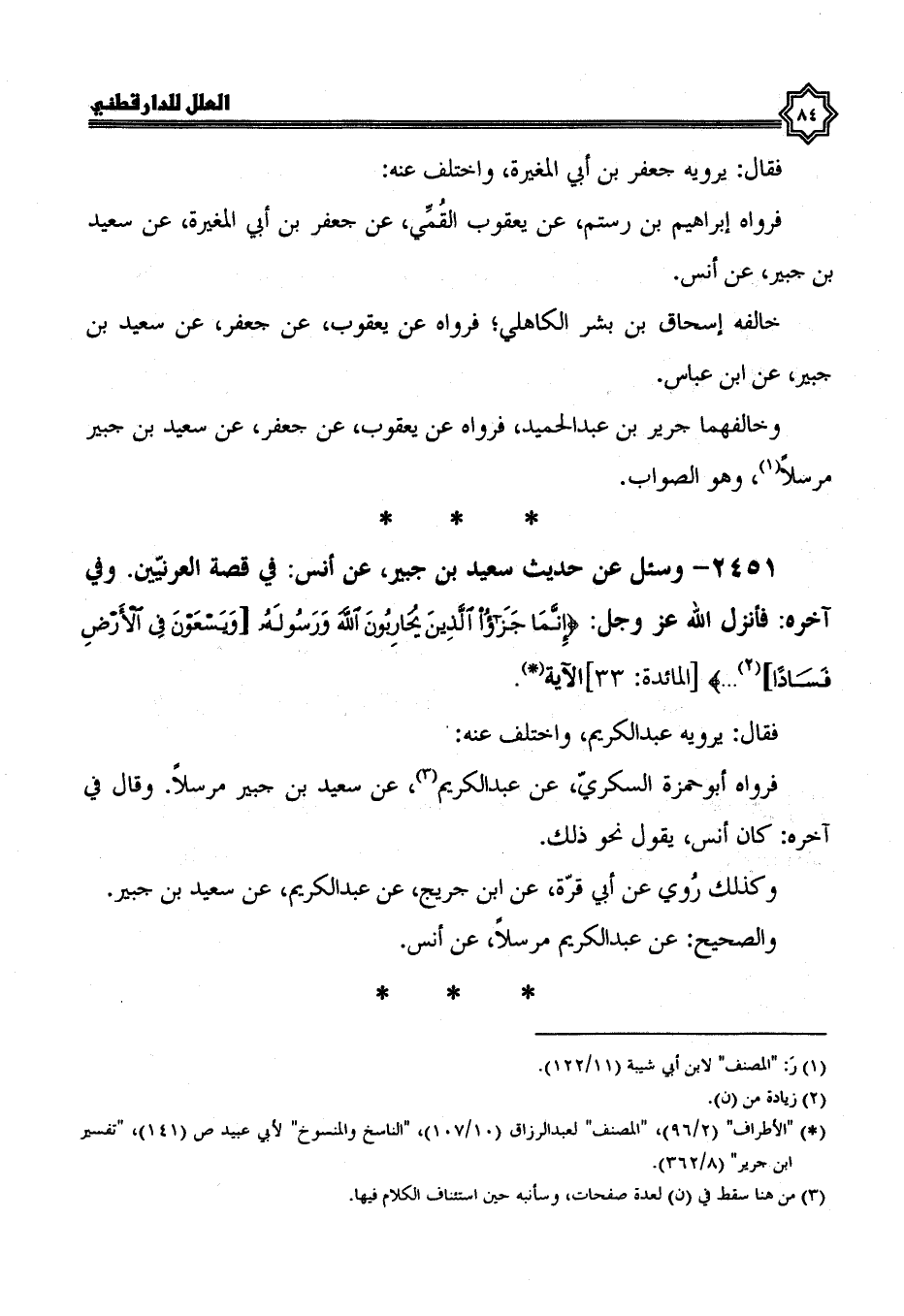 2451- وَسُئِلَ عَنْ حَدِيثِ سَعِيدِ بْنِ جبير، عن أنس في قصة العرنيين، وفي آخره: فأنزل الله عز وجل: {إنما جزاء الذين يحاربون الله ورسوله ويسعون في الأرض فسادا} .