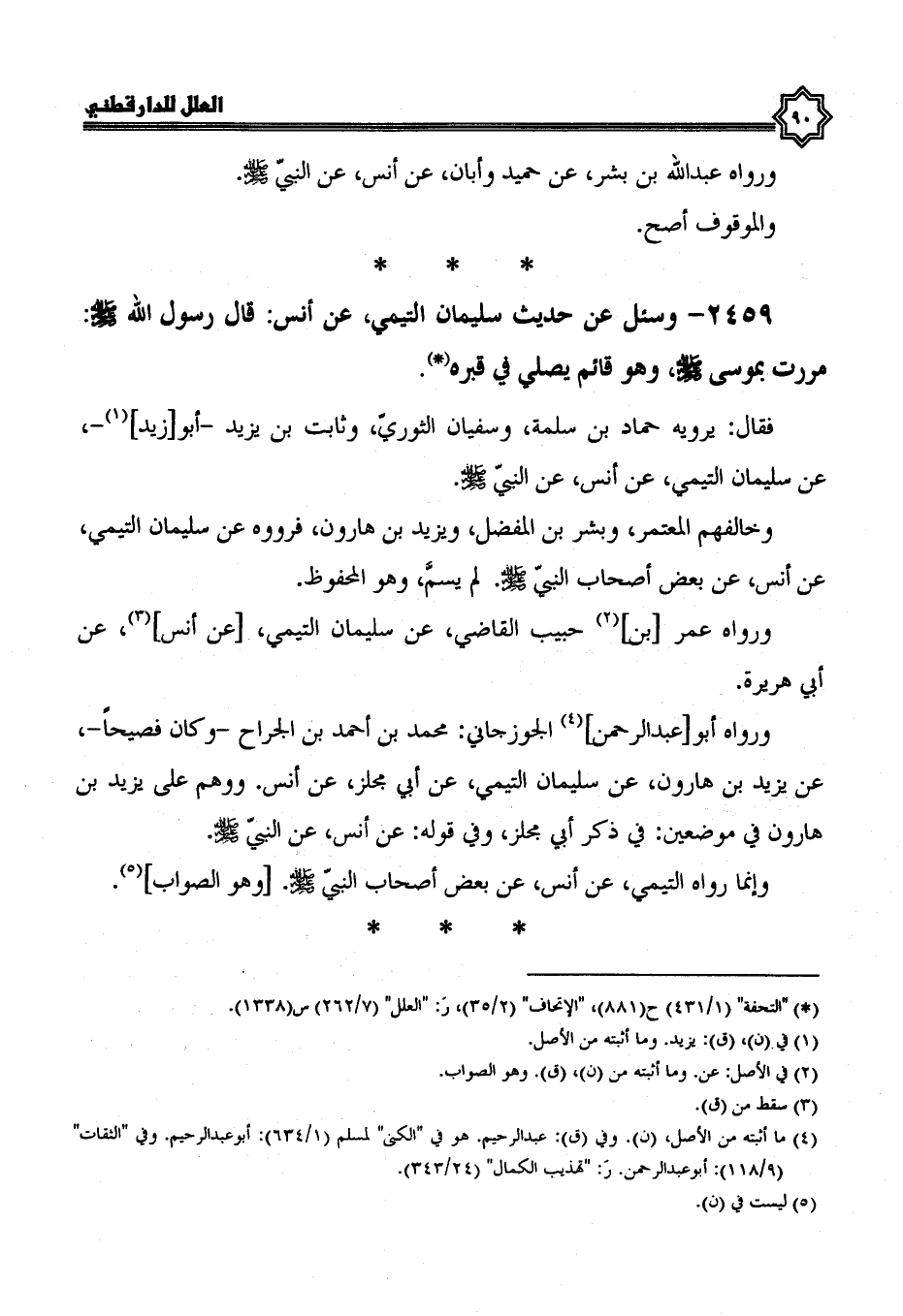 2459- وسئل عن حديث سليمان التيمي، عن أنس، قال رسول الله صلى الله عليه وسلم: مررت بموسى صلى الله عليه وسلم، وهو قائم يصلي في قبره.