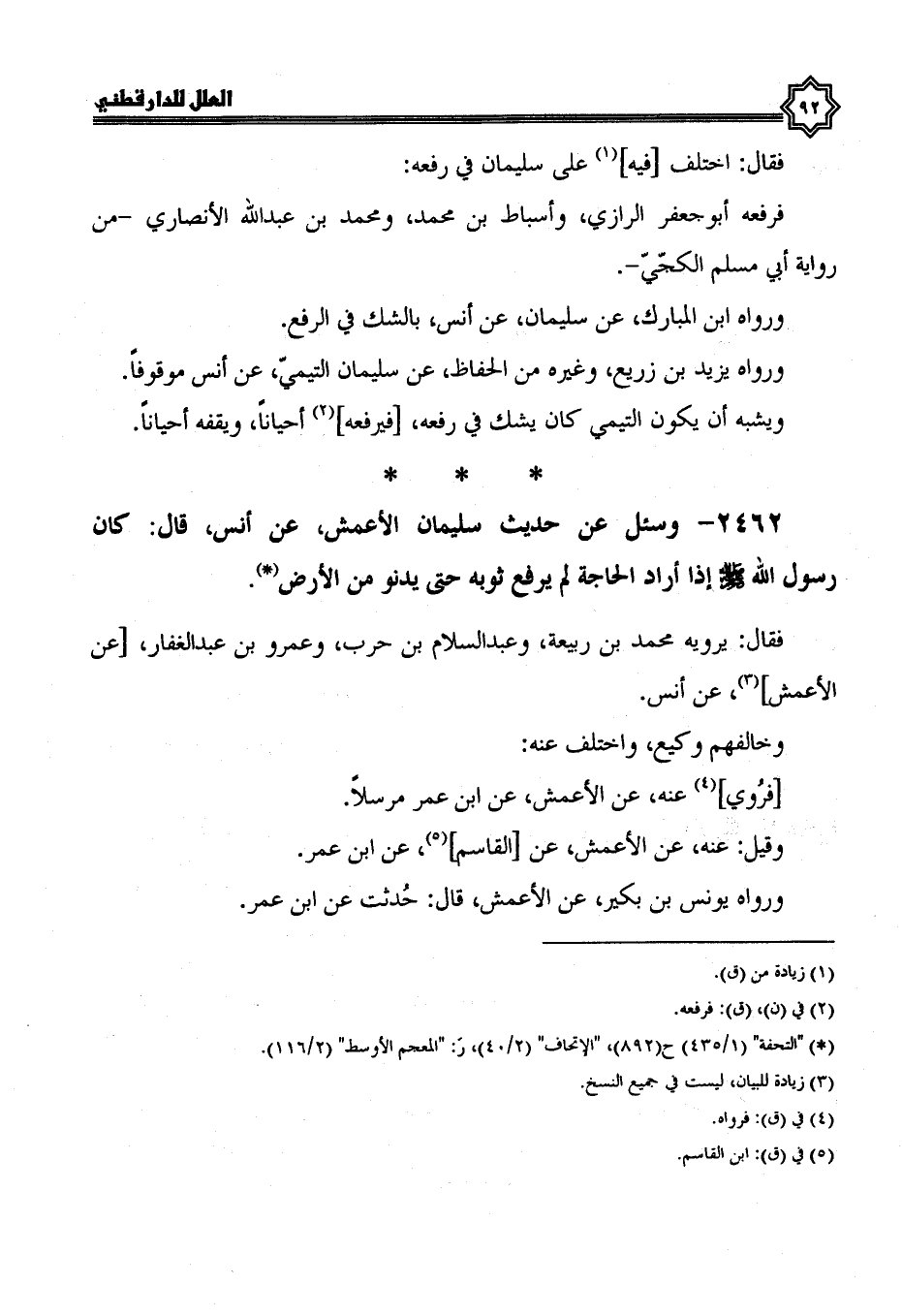 2462- وسئل عن حديث سليمان الأعمش، عن أنس، قَالَ: كَانَ رَسُولُ اللَّهِ صَلَّى اللَّهُ عَلَيْهِ وسلم إذا أراد الحاجة لم يرفع ثوبه حتى يدنو من الأرض.