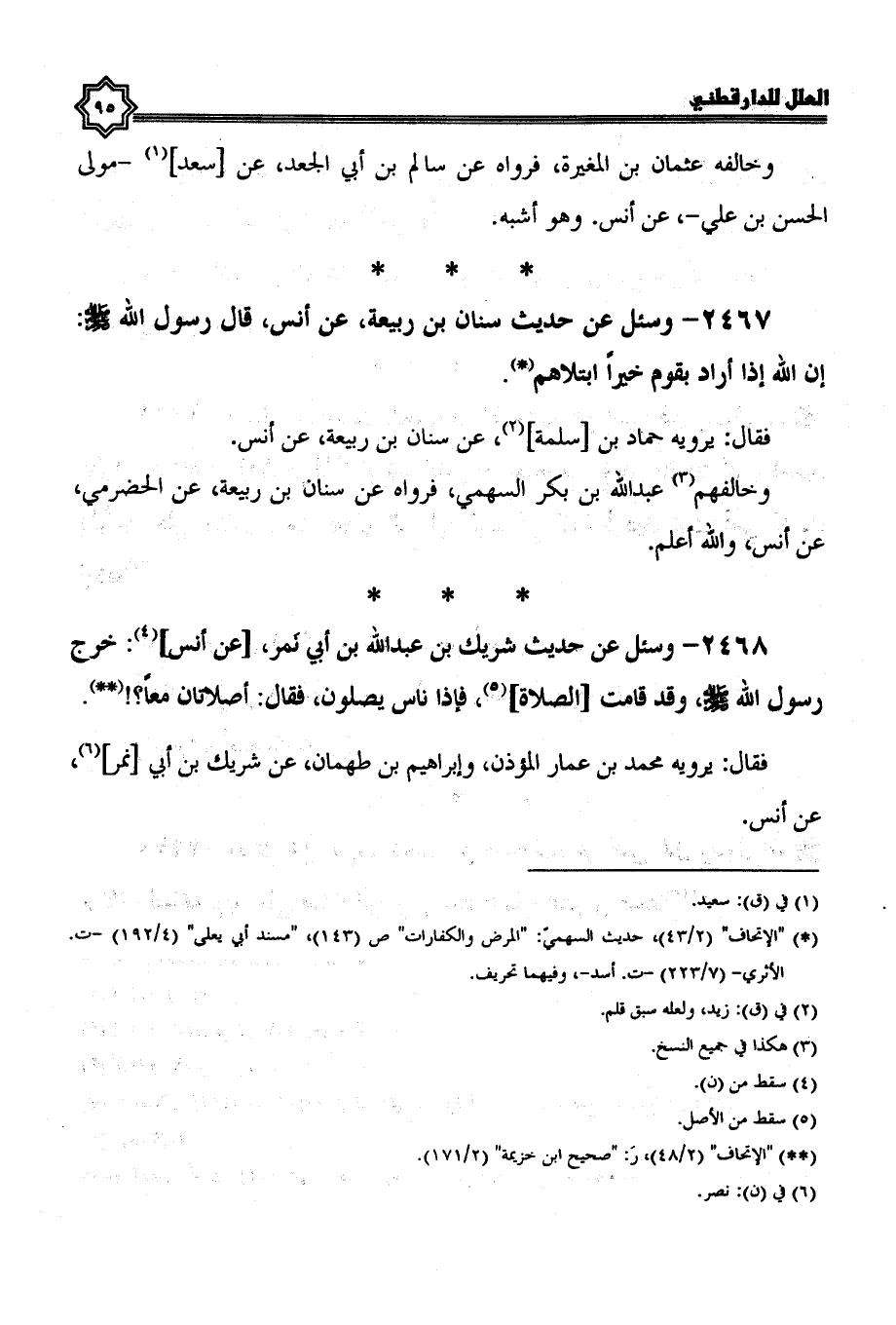 2467- وسئل عن حديث سنان بن ربيعة، عن أنس، قال رسول الله صلى الله عليه وسلم: إن الله إذا أراد بقوم خيرا ابتلاهم.