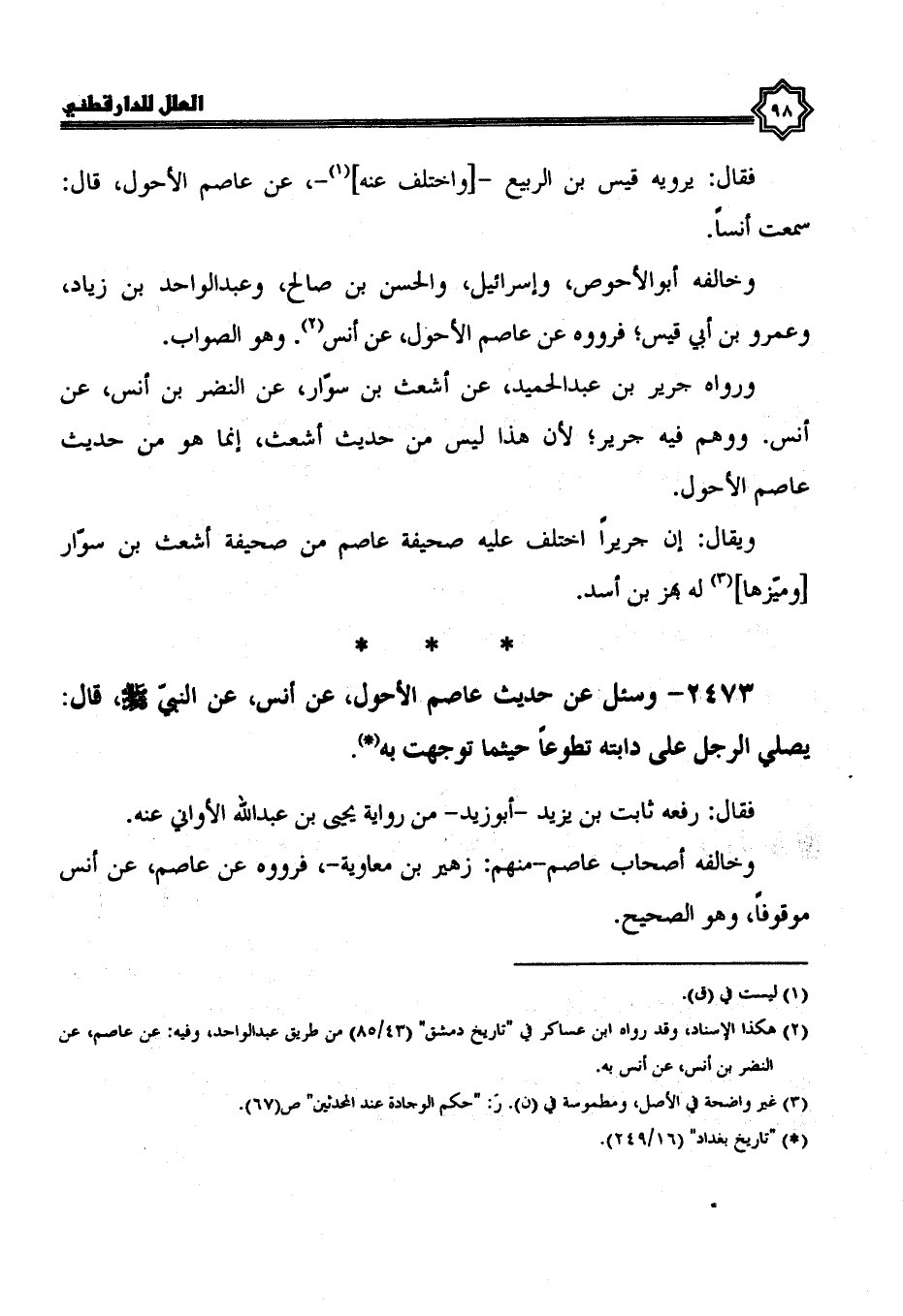 2473- وسئل عن حديث عاصم الأحول، عَنْ أَنَسٍ، عَنِ النَّبِيِّ صَلَّى اللَّهُ عَلَيْهِ وسلم، قال: يصلي الرجل على دابته تطوعا حيثما توجهت به.