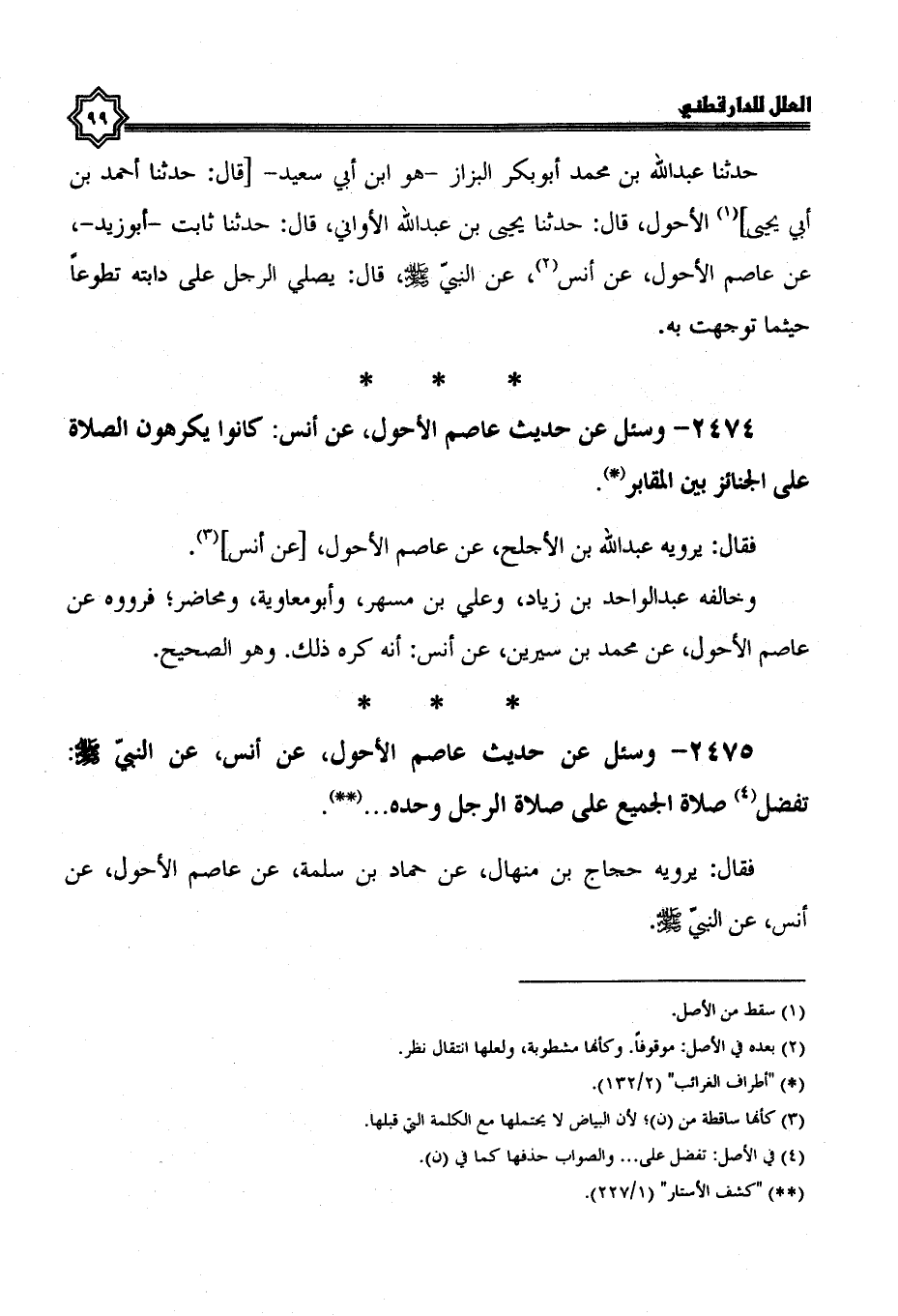 وخالفه عبد الواحد بن زياد، وعلي بن مسهر، وأبو معاوية، ومحاضر؛ فرووه عن عاصم الأحول، عن محمد بن سيرين، عن أنس أنه كره ذلك، وهو الصحيح.