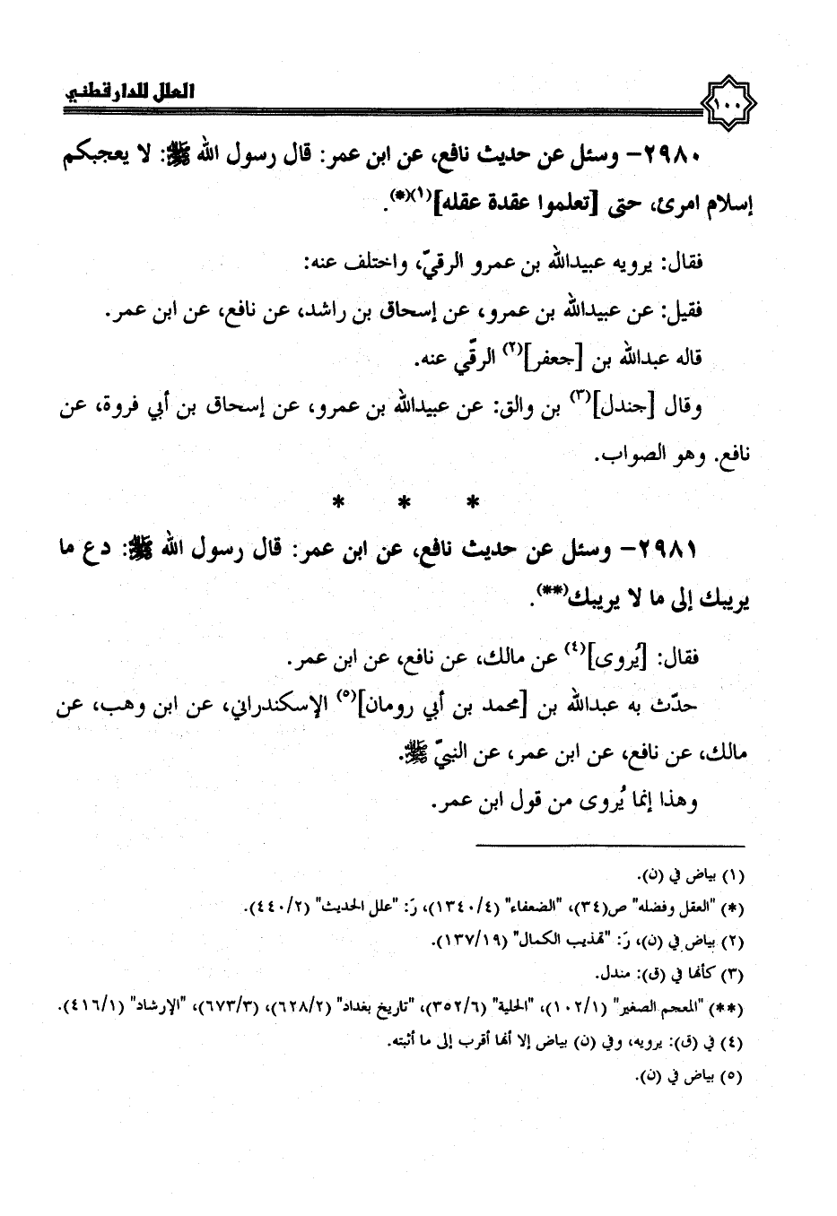 2980- وَسُئِلَ عَنْ حَدِيثِ نَافِعٍ، عَنِ ابْنِ عُمَرَ: قَالَ رَسُولُ اللَّهِ صَلَّى الله عليه وسلم: لا يعجبكم إسلام امرئ، حتى تعلموا عقدة عقله.