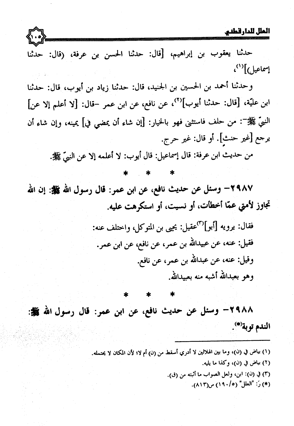 2987- وَسُئِلَ عَنْ حَدِيثِ نَافِعٍ، عَنِ ابْنِ عُمَرَ: قَالَ رَسُولُ اللَّهِ صَلَّى اللَّهُ عَلَيْهِ وَسَلَّمَ: إِنَّ اللَّهَ تَجَاوَزَ لِأُمَّتِي عما أخطأت، أو نسيت، أو استكرهت عليه.
