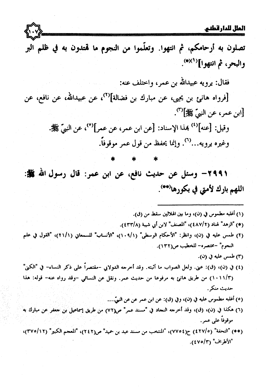 2990- وَسُئِلَ عَنْ حَدِيثِ نَافِعٍ، عَنِ ابْنِ عُمَرَ: قَالَ رَسُولُ اللَّهِ صَلَّى الله عليه وسلم: تعلموا من أمر النساء ما يحل لكم، وما يحرم عليكم، ثم انتهوا، وتعلموا من الأنساب ما تصلون به أرحامكم، ثم انتهوا، وتعلموا من النجوم ما تهتدون به في ظلم البر والبحر، ثم انتهوا.