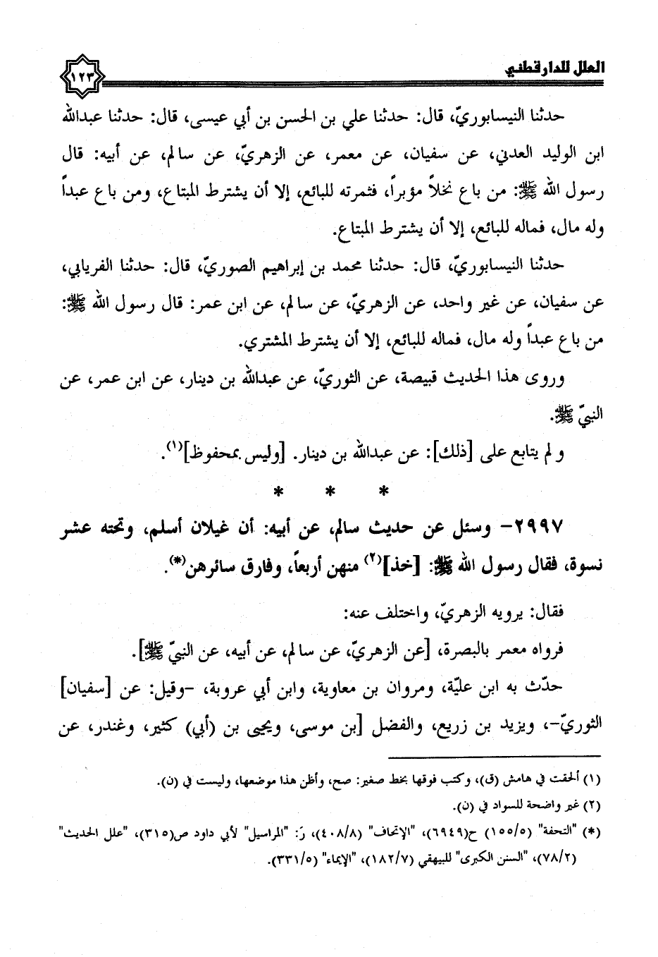 2997- وسئل عن حديث سالم، عن أبيه؛ أن غيلان أسلم، وتحته عشر نسوة، فَقَالَ رَسُولُ اللَّهِ صَلَّى اللَّهُ عَلَيْهِ وَسَلَّمَ: خذ منهن أربعا، وفارق سائرهن.