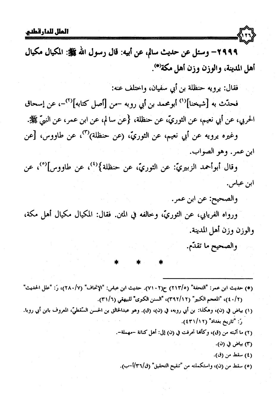 2999- وَسُئِلَ عَنْ حَدِيثِ سَالِمٍ، عَنْ أَبِيهِ: قَالَ رَسُولُ اللَّهِ صَلَّى اللَّهُ عليه وسلم: المكيال مكيال أهل المدينة، والوزن وزن أهل مكة.