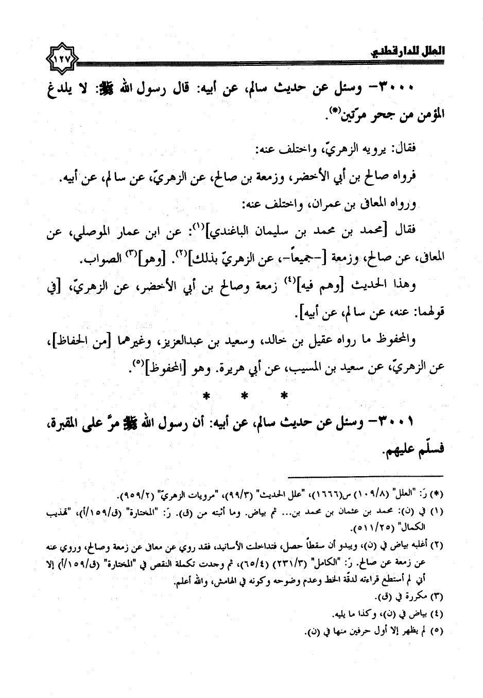 3000- وَسُئِلَ عَنْ حَدِيثِ سَالِمٍ، عَنْ أَبِيهِ: قَالَ رَسُولُ اللَّهِ صَلَّى اللَّهُ عَلَيْهِ وَسَلَّمَ: لَا يُلْدَغُ الْمُؤْمِنُ مِنْ جُحْرٍ مَرَّتَيْنِ.