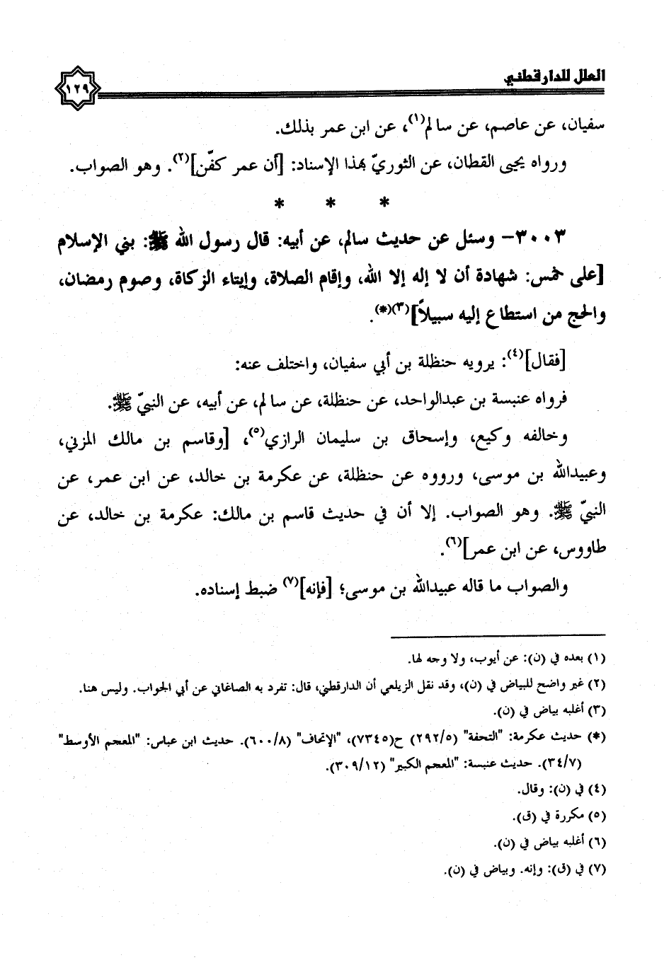 3003- وَسُئِلَ عَنْ حَدِيثِ سَالِمٍ، عَنْ أَبِيهِ قَالَ رَسُولُ اللَّهِ صَلَّى اللَّهُ عليه وسلم: بني الإسلام على خمس شهادة أن لا إله إلا الله، وإقام الصلاة، وإيتاء الزكاة، وصوم رمضان، والحج من استطاع إليه سبيلا.