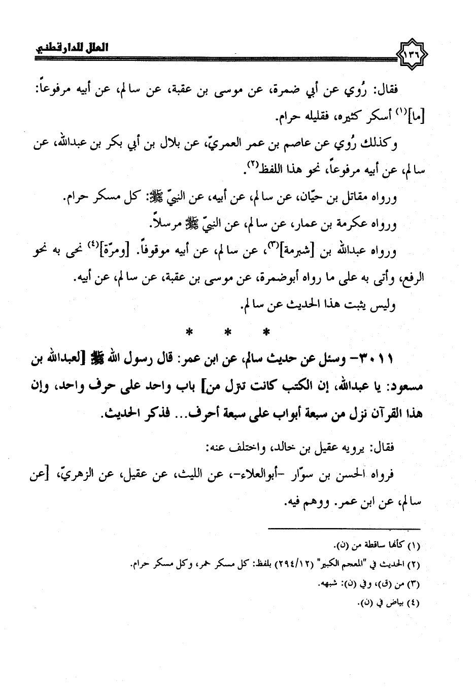 3010- وَسُئِلَ عَنْ حَدِيثِ سَالِمٍ، عَنِ ابْنِ عُمَرَ: قَالَ رَسُولُ اللَّهِ صلى الله عليه وسلم: ما أسكر كثيرة فقليله حرام.