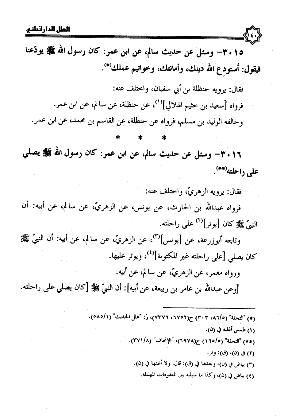 3016- وَسُئِلَ عَنْ حَدِيثِ سَالِمٍ، عَنِ ابْنِ عُمَرَ؛ كَانَ رَسُولُ اللَّهِ صَلَّى اللَّهُ عَلَيْهِ وَسَلَّمَ يصلي على راحلته.