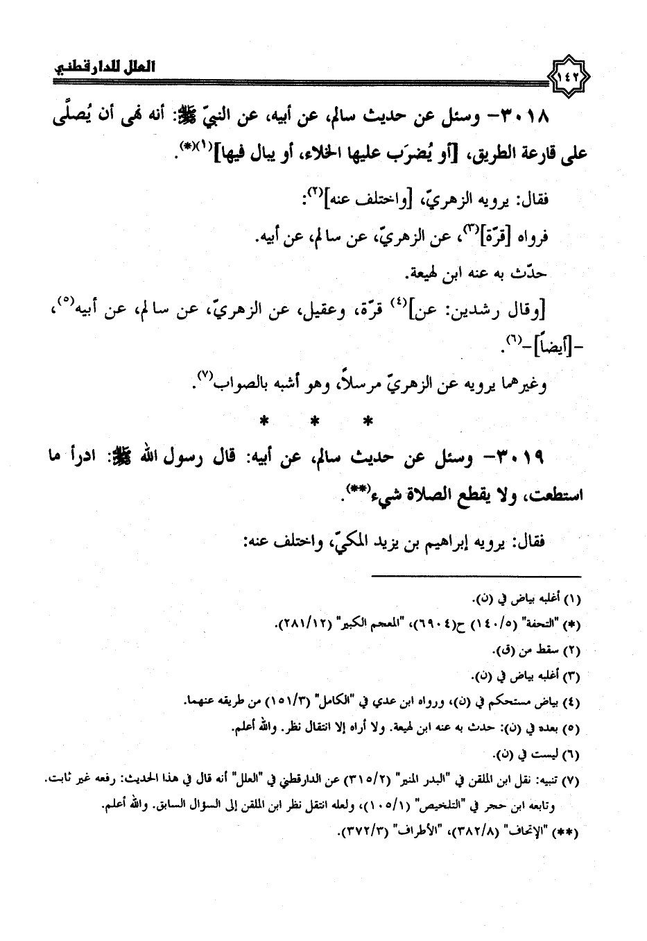 3018- وَسُئِلَ عَنْ حَدِيثِ سَالِمٍ، عَنْ أَبِيهِ، عَنِ النَّبِيِّ صَلَّى اللَّهُ عَلَيْهِ وسلم؛ أنه نهى أن يصلى على قارعة الطريق، أو يضرب عليها الخلاء، أو يبال فيها.