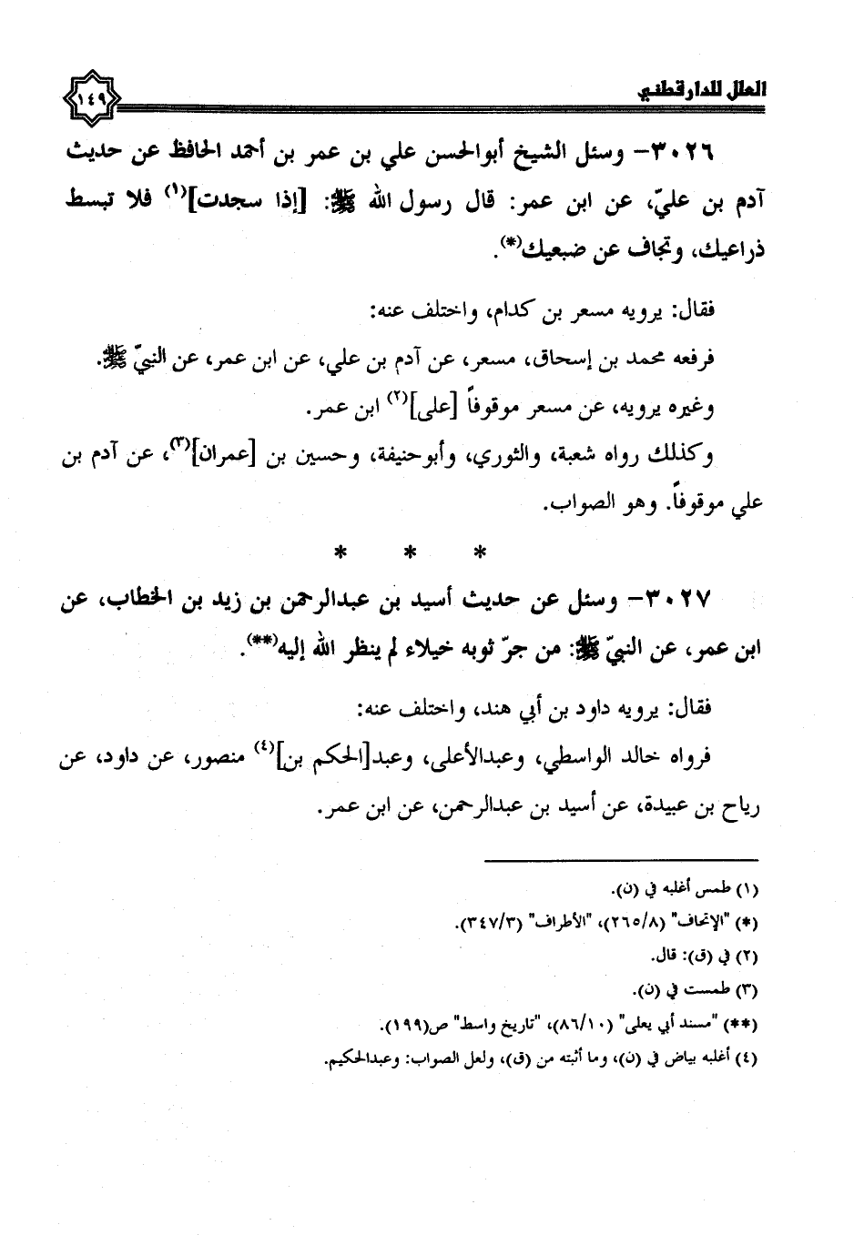 3026- وَسُئِلَ الشَّيْخُ أَبُو الْحَسَنِ عَلِيُّ بْنُ عُمَرَ بن أحمد الحافظ عن حديث آدم بن علي، عَنِ ابْنِ عُمَرَ: قَالَ رَسُولُ اللَّهِ صَلَّى اللَّهُ عَلَيْهِ وسلم: إذا سجدت فلا تبسط ذراعيك، وتجاف عن ضبعيك.