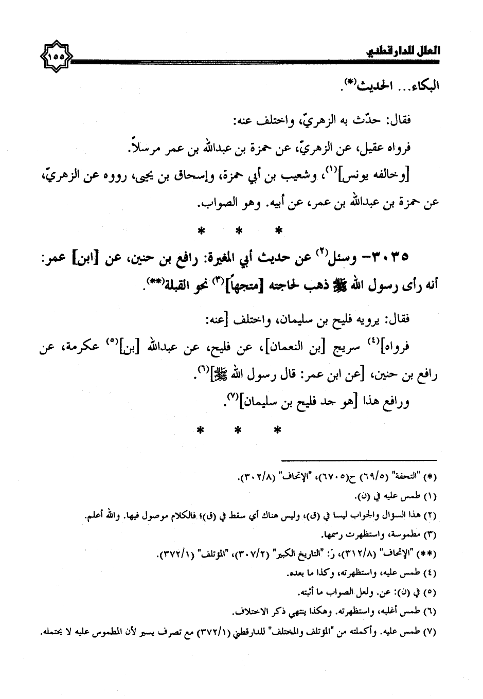 3035- وسئل عن حديث أبي المغيرة: رافع بن حنين، عن ابن عمر؛ أنه رَأَى رَسُولُ اللَّهِ صَلَّى اللَّهُ عَلَيْهِ وَسَلَّمَ ذهب لحاجته متجها نحو القبلة.