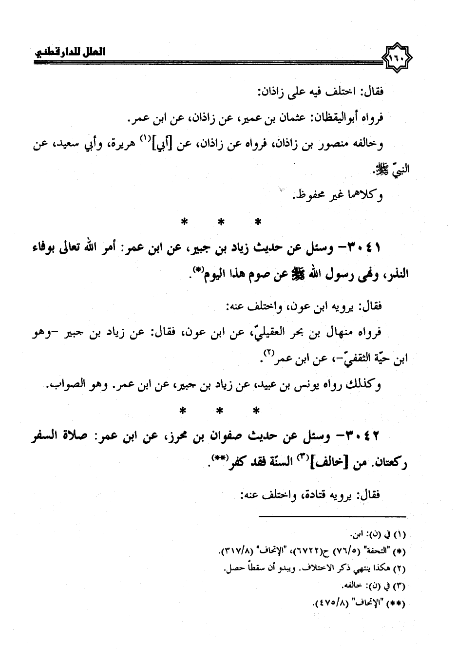 3042- وسئل عن حديث صفوان بن محرز، عن ابن عمر: صلاة السفر ركعتان، من خالف السنة فقد كفر.
