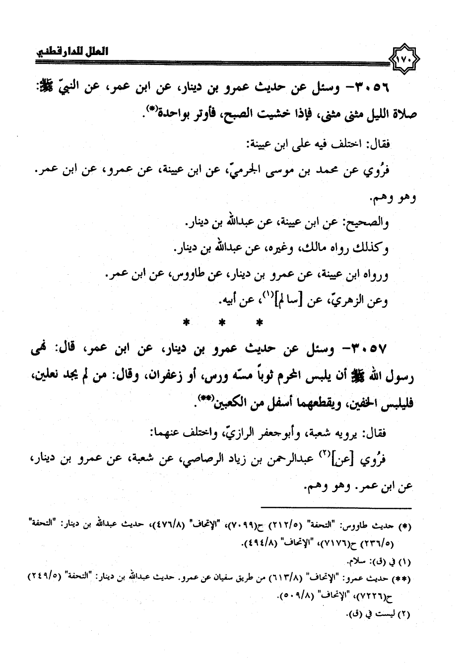 3057- وسئل عن حديث عمرو بن دينار، عن ابن عمر، قَالَ: نَهَى رَسُولُ اللَّهِ صَلَّى اللَّهُ عَلَيْهِ وسلم أن يلبس المحرم ثوبا مسه ورس، أو زعفران، وقال: من لم يجد نعلين، فليلبس الخفين، ويقطعهما أسفل من الكعبين.