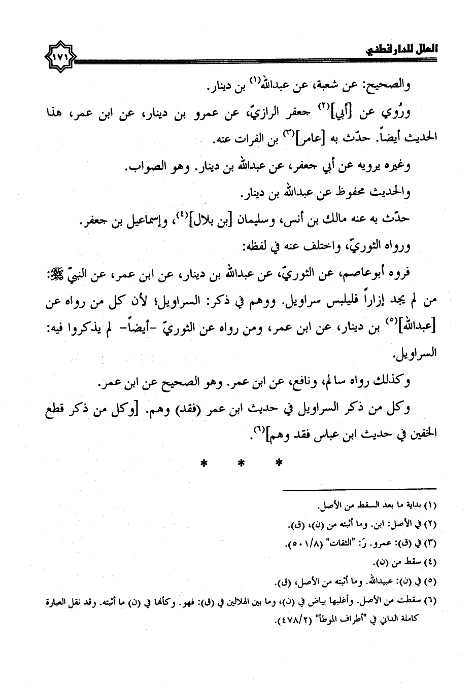 ووهم في ذكر السراويل، لأن كل من رَوَاهُ عَنْ عَبْدِ اللَّهِ بْنِ دِينَارٍ، عَنِ ابْنِ عمر، ومن رواه عن الثوري أيضا، لم يذكروا فيه السراويل.