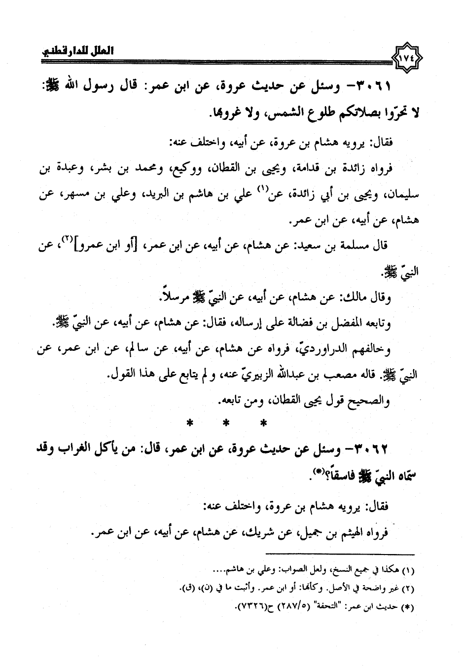 3061- وسئل عن حديث عروة، عَنِ ابْنِ عُمَرَ: قَالَ رَسُولُ اللَّهِ صَلَّى اللَّهُ عَلَيْهِ وسلم لا تحروا بصلاتكم طلوع الشمس، ولا غروبها.