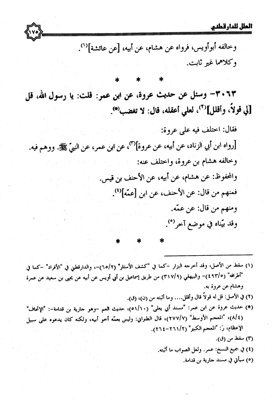 3063- وسئل عن حديث عروة، عن ابن عمر: قلت: يا رسول الله، قل لي قولا، وأقلل، لعلي أعقله، قال: لا تغضب.