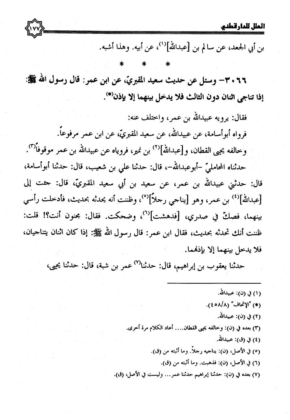 3066- وسئل عن حديث سعيد المقبري، عَنِ ابْنِ عُمَرَ: قَالَ رَسُولُ اللَّهِ صَلَّى اللَّهُ عَلَيْهِ وسلم: إذا تناجى اثنان دون الثالث فلا يدخل بينهما إلا بإذن.