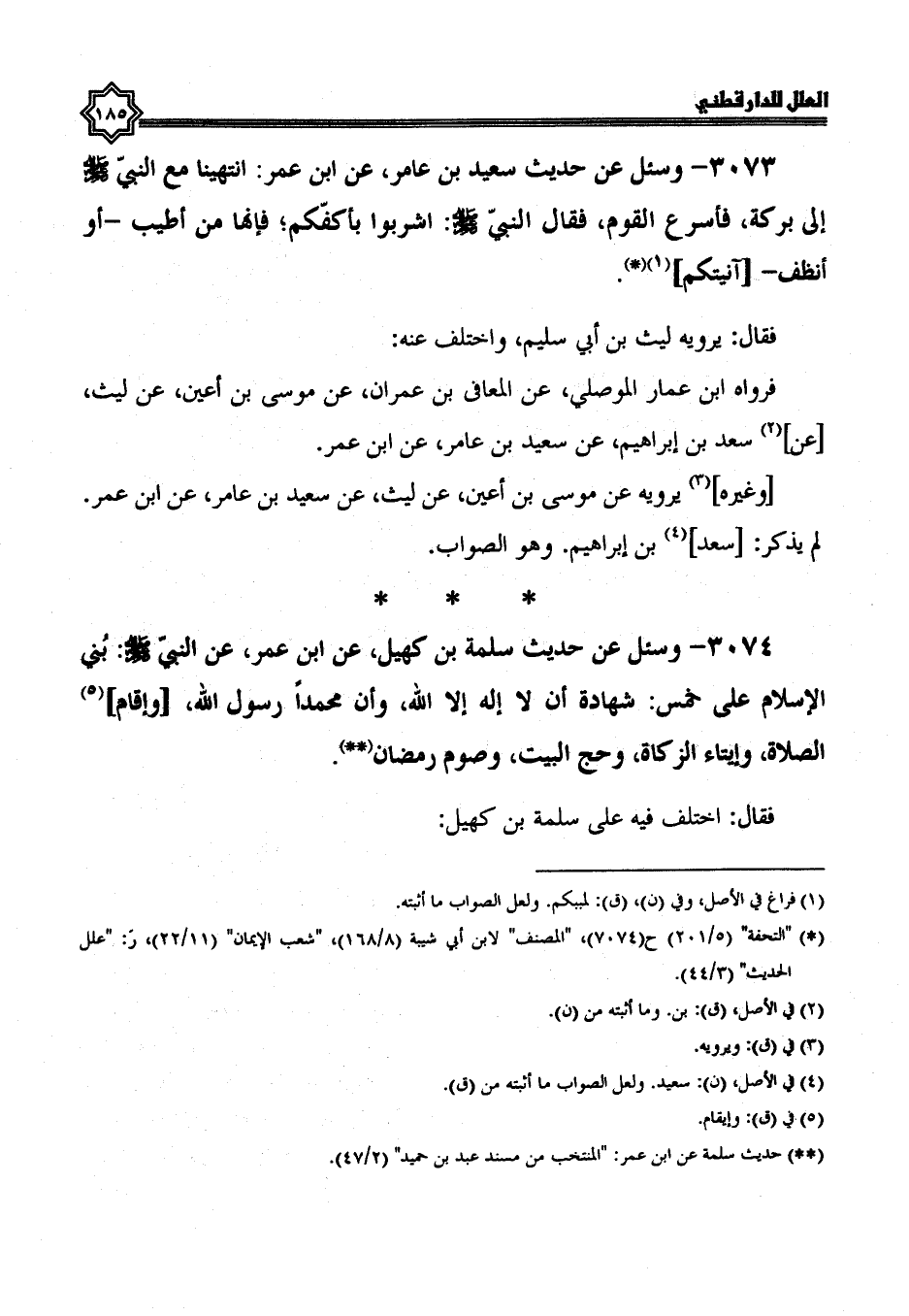 3073- وَسُئِلَ عَنْ حَدِيثِ سَعِيدِ بْنِ عامر، عن ابن عمر: انتهينا مَعَ النَّبِيِّ صَلَّى اللَّهُ عَلَيْهِ وَسَلَّمَ إِلَى بركة، فأسرع القوم، فقال النبي صلى الله عليه وسلم: اشربوا بأكفكم، فإنها من أطيب، أو أنظف، آنيتكم.