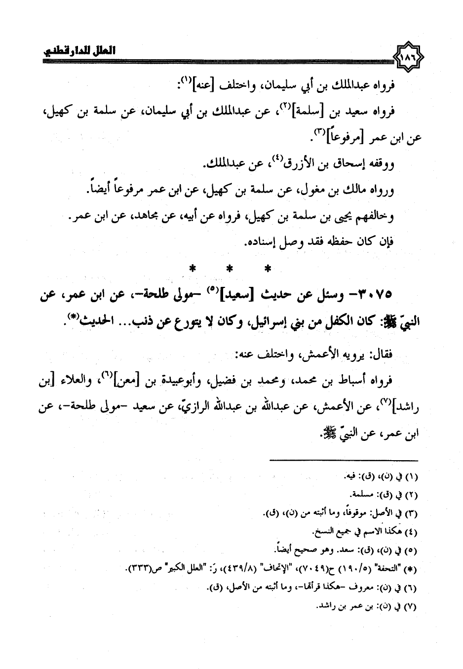 3075- وسئل عن حديث سعيد، مولى طلحة، عَنِ ابْنِ عُمَرَ، عَنِ النَّبِيِّ صَلَّى اللَّهُ عليه وسلم: كان الكفل من بني إسرائيل، وكان لا يتورع عن ذنب ... الْحَدِيثَ.