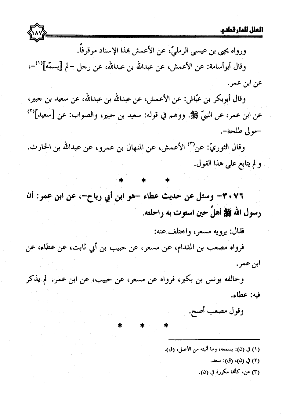 3076- وسئل عن حديث عطاء، هو ابن أبي رباح، عَنِ ابْنِ عُمَرَ؛ أَنَّ رَسُولَ اللَّهِ صَلَّى الله عليه وسلم أهل حين استوت به راحلته.
