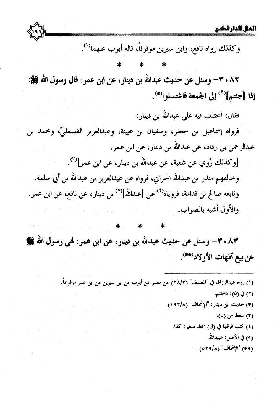 3082- وَسُئِلَ عَنْ حَدِيثِ عَبْدِ اللَّهِ بْنِ دِينَارٍ، عَنِ ابْنِ عُمَرَ: قَالَ رَسُولُ اللَّهِ صَلَّى اللَّهُ عَلَيْهِ وسلم: إذا جئتم إلى الجمعة فاغتسلوا.