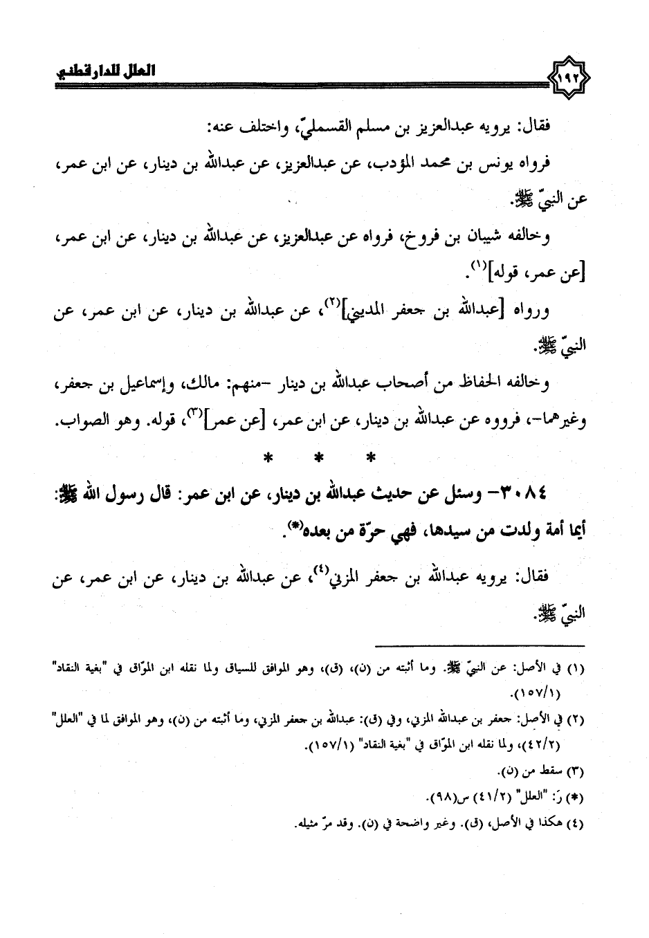 3084- وَسُئِلَ عَنْ حَدِيثِ عَبْدِ اللَّهِ بْنِ دِينَارٍ، عَنِ ابْنِ عُمَرَ: قَالَ رَسُولُ اللَّهِ صَلَّى اللَّهُ عَلَيْهِ وسلم أيما أمة ولدت من سيدها، فهي حرة من بعده.