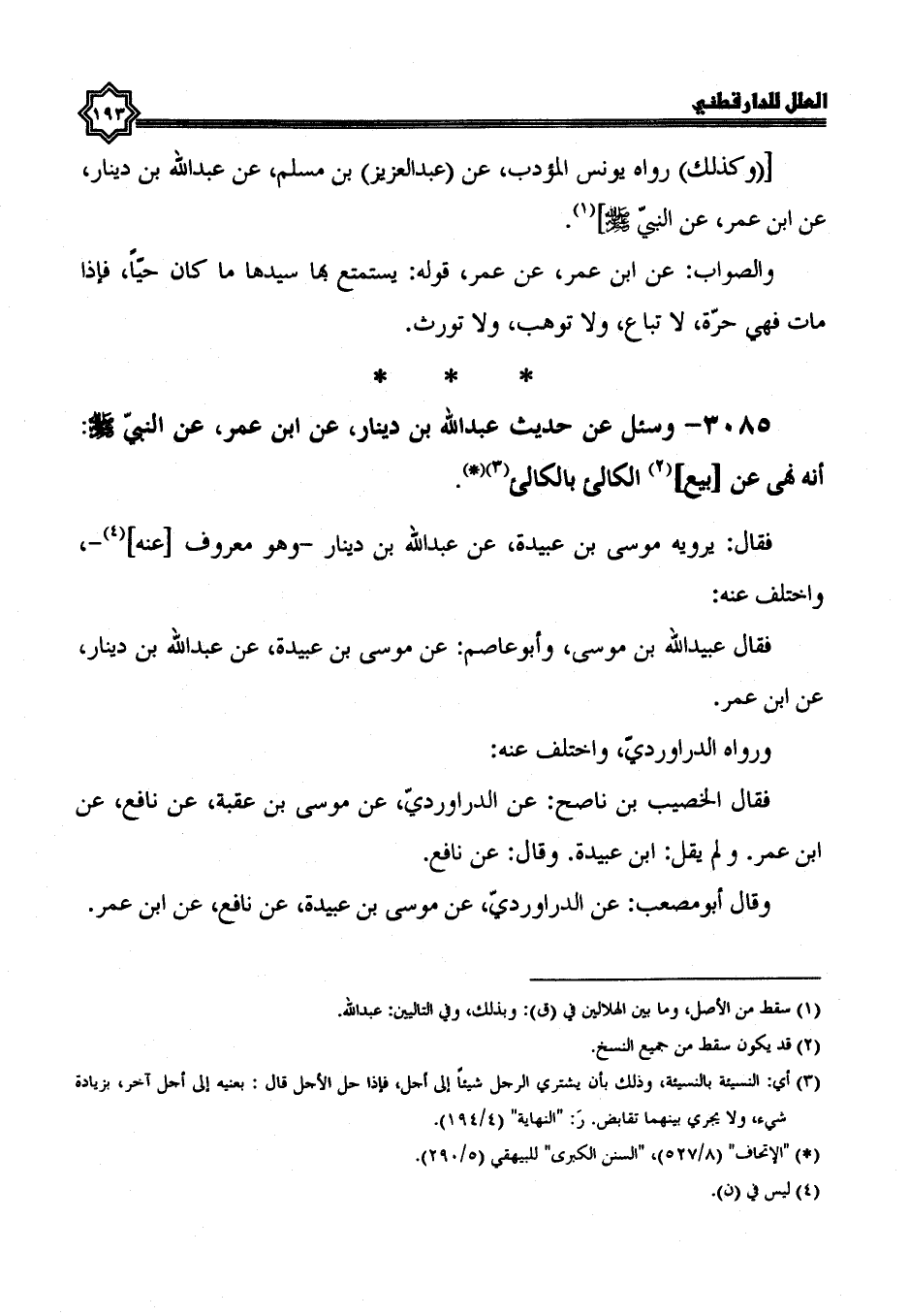 3085- وَسُئِلَ عَنْ حَدِيثِ عَبْدِ اللَّهِ بْنِ دِينَارٍ، عَنِ ابْنِ عُمَرَ، عَنِ النَّبِيِّ صَلَّى اللَّهُ عليه وسلم إنه نهى عن بيع الكالئ بالكالئ.