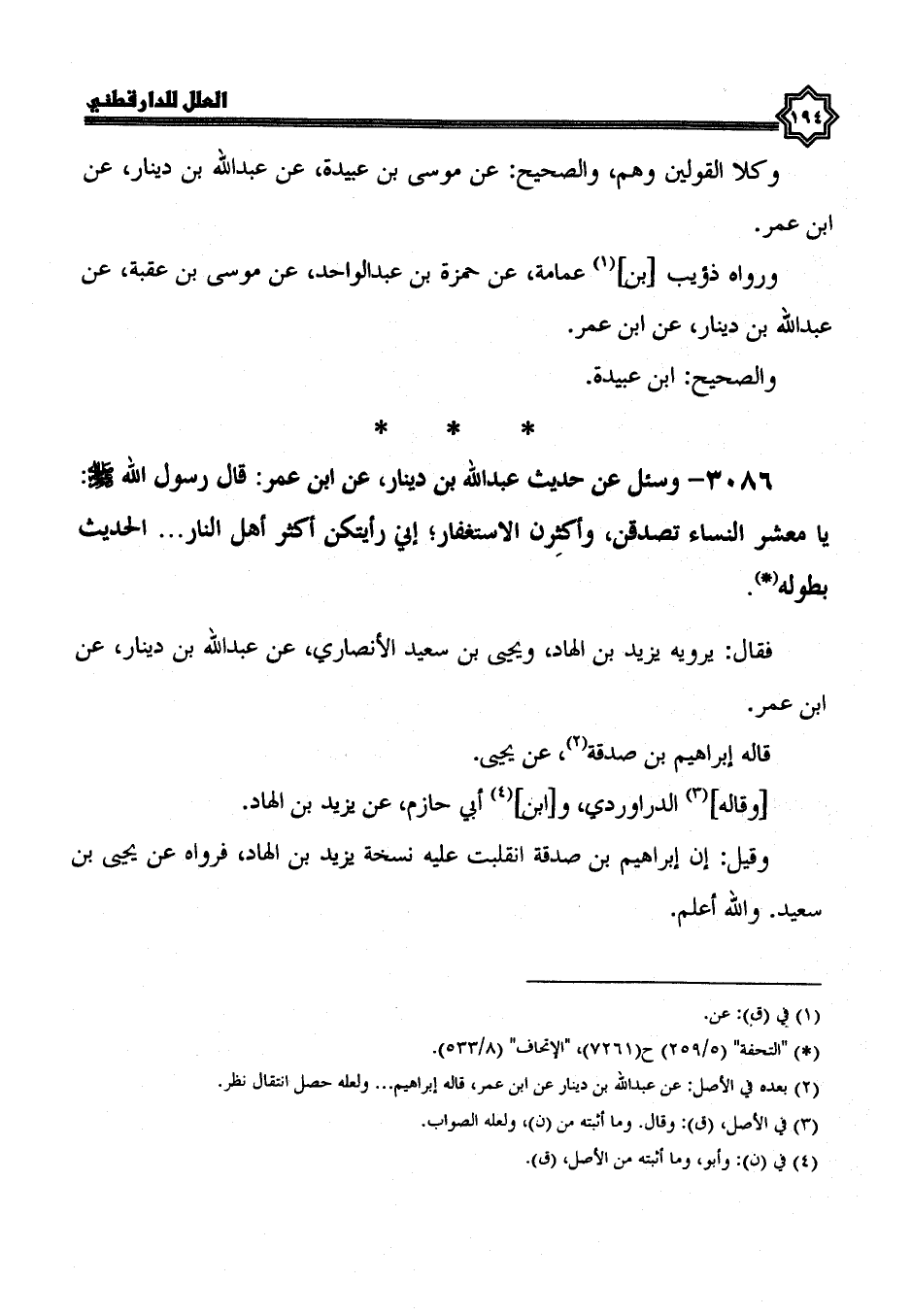 3086- وَسُئِلَ عَنْ حَدِيثِ عَبْدِ اللَّهِ بْنِ دِينَارٍ، عَنِ ابْنِ عُمَرَ: قَالَ رَسُولُ اللَّهِ صَلَّى اللَّهُ عَلَيْهِ وسلم يا معشر النساء تصدقن، وأكثرن الاستغفار، إني رأيتكن أكثر أهل النار ... الحديث بطوله.