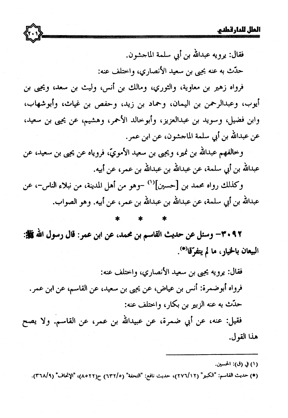 3092- وَسُئِلَ عَنْ حَدِيثِ الْقَاسِمِ بْنِ مُحَمَّدٍ، عَنْ ابْنِ عُمَرَ: قَالَ رَسُولُ اللَّهِ صَلَّى اللَّهُ عَلَيْهِ وسلم: البيعان بالخيار، ما لم يتفرقا.