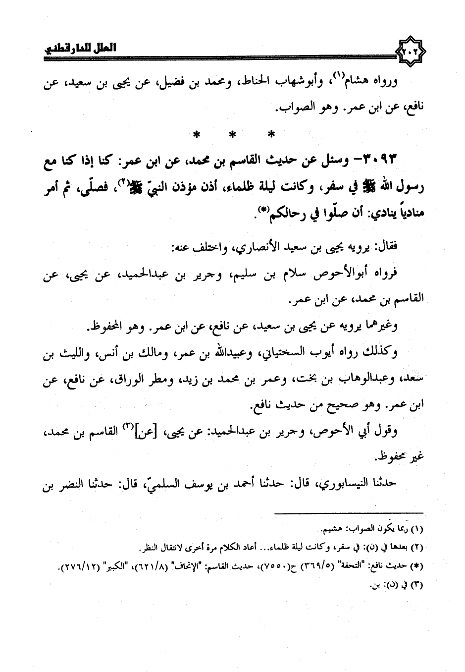 3093- وَسُئِلَ عَنْ حَدِيثِ الْقَاسِمِ بْنِ مُحَمَّدٍ، عَنْ ابن عمر، كُنَّا إِذَا كُنَّا، مَعَ رَسُولِ اللَّهِ صَلَّى اللَّهُ عَلَيْهِ وسلم في سفر، وكانت ليلة ظلماء، أذن مؤذن النبي صلى الله عليه وسلم، فصلى ثم أمر مناديا ينادي؛ أن صلوا في رحالكم.