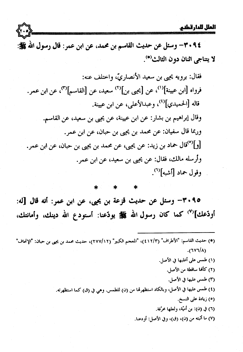 3094- وَسُئِلَ عَنْ حَدِيثِ الْقَاسِمِ بْنِ مُحَمَّدٍ، عَنْ ابْنِ عُمَرَ، قَالَ رَسُولُ اللَّهِ صَلَّى اللَّهُ عَلَيْهِ وسلم: لا يتناجى اثنان دون الثالث.