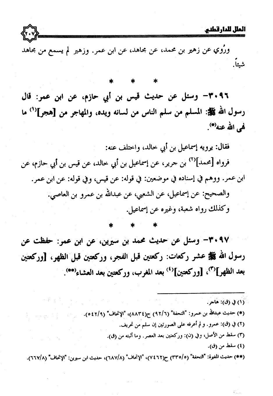 3096- وَسُئِلَ عَنْ حَدِيثِ: قَيْسِ بْنِ أَبِي حَازِمٍ، عَنِ ابْنِ عُمَرَ، قَالَ رَسُولُ اللَّهِ صَلَّى اللَّهُ عَلَيْهِ وسلم: المسلم من سلم الناس من لسانه ويده، والمهاجر من هجر ما نهى الله عنه.